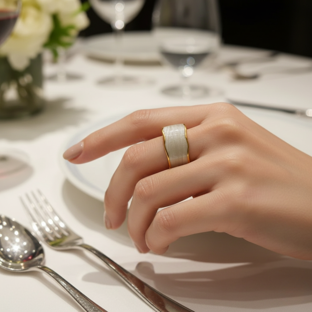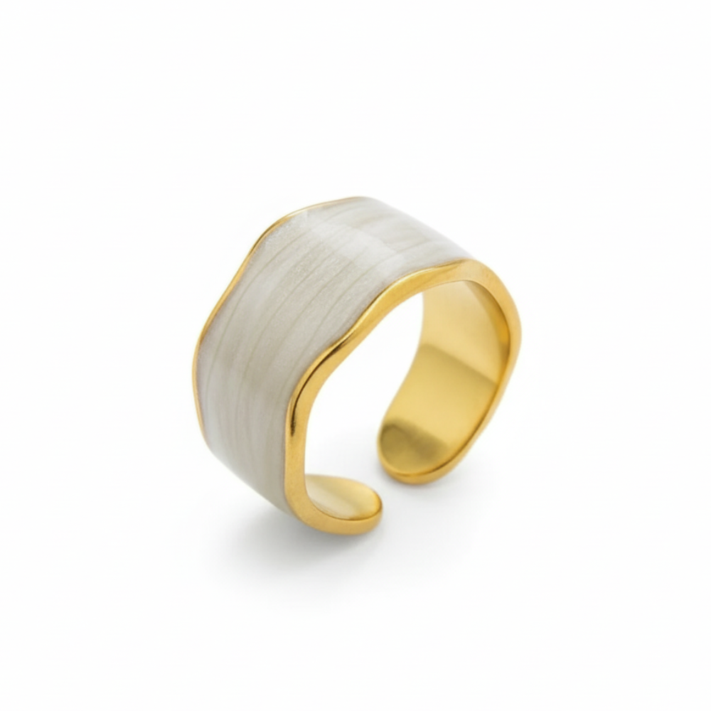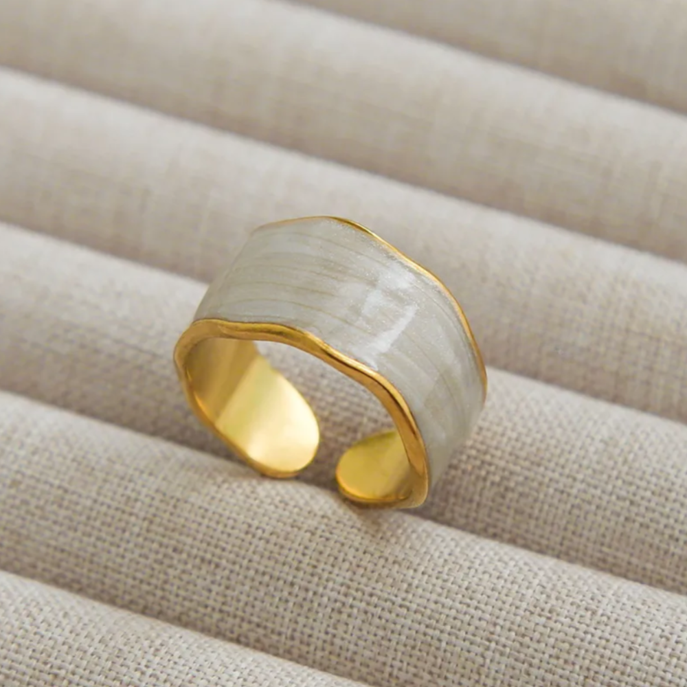 Elegant gold-plated ring featuring a smooth white enamel wave design — resizable for a perfect fit and ideal for adding timeless sophistication to any outfit.