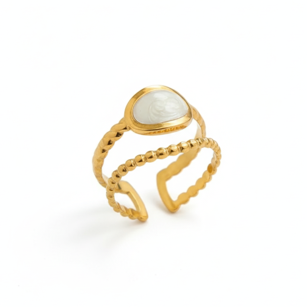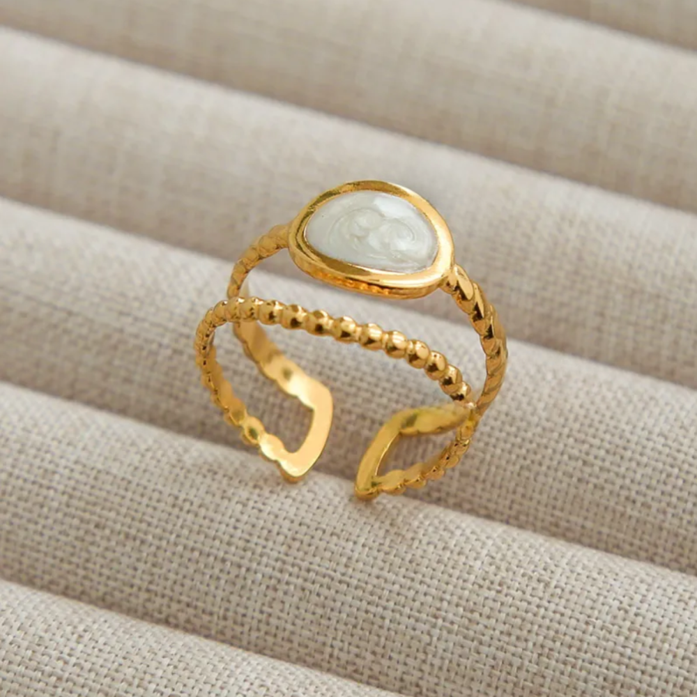 Delicate gold-plated ring with a unique double-band texture and glossy white stone — resizable for a perfect fit, blending modern charm with timeless elegance.