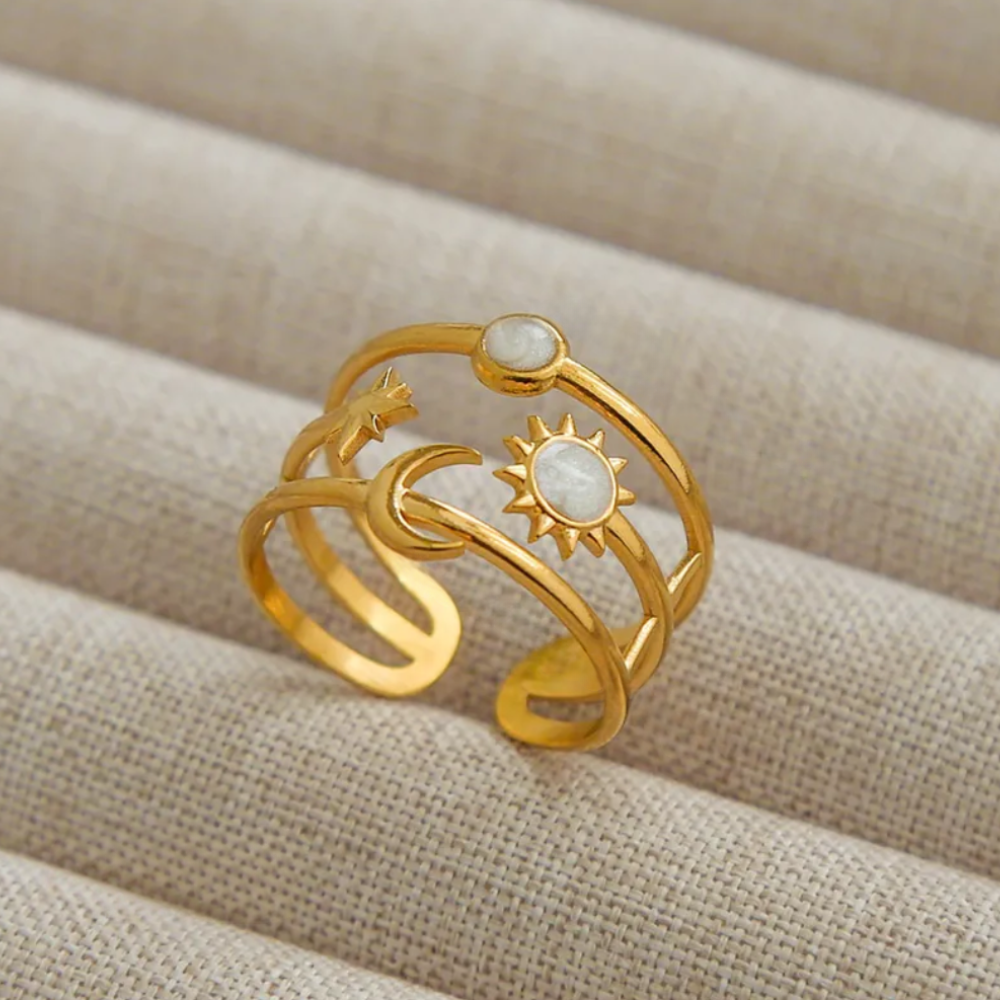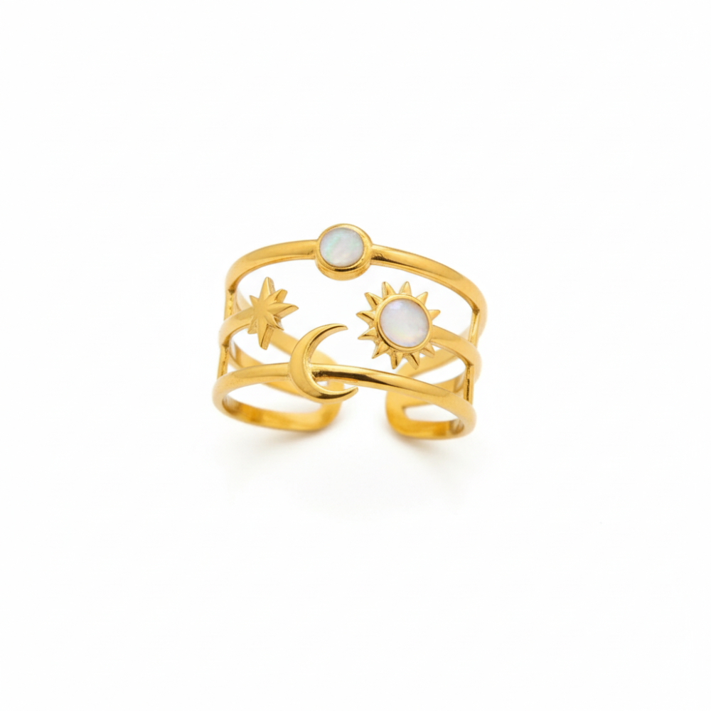Gold-plated celestial ring featuring sun, moon, and star motifs with luminous white stones — resizable for a perfect fit, symbolizing harmony and cosmic elegance.
