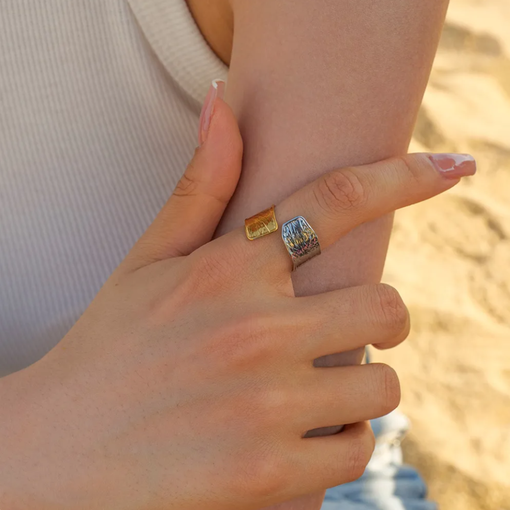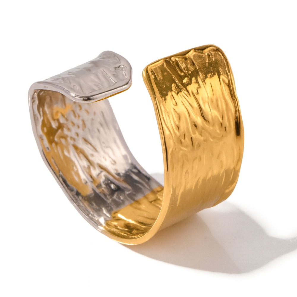 Bold two-tone ring in gold and silver with a textured finish — resizable for a perfect fit, blending modern contrast with effortless elegance.