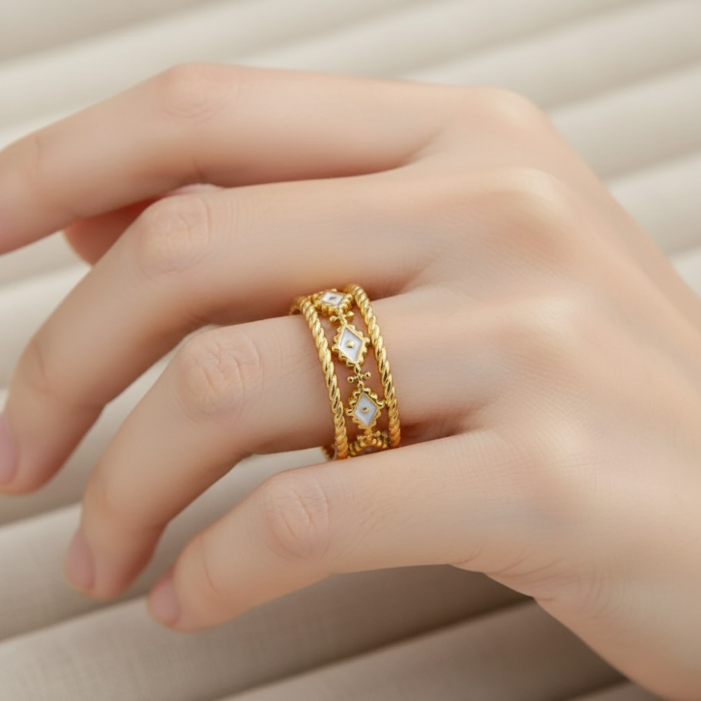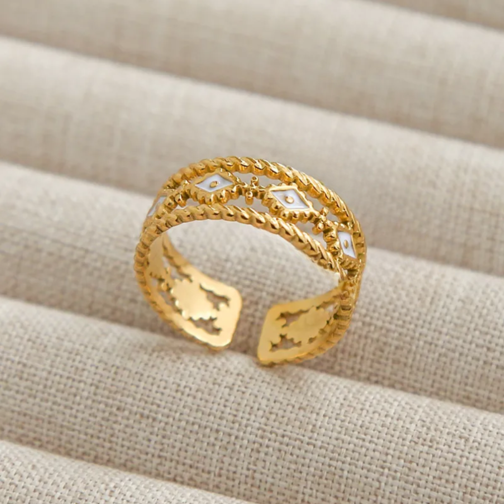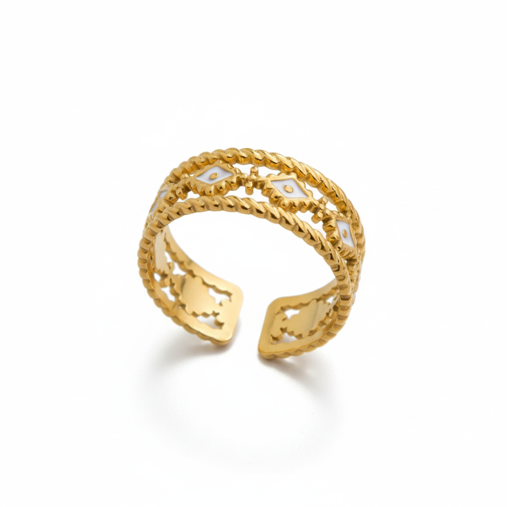 Elegant gold-plated ring with intricate braided details and white enamel accents — resizable for a perfect fit and ideal for everyday sophistication