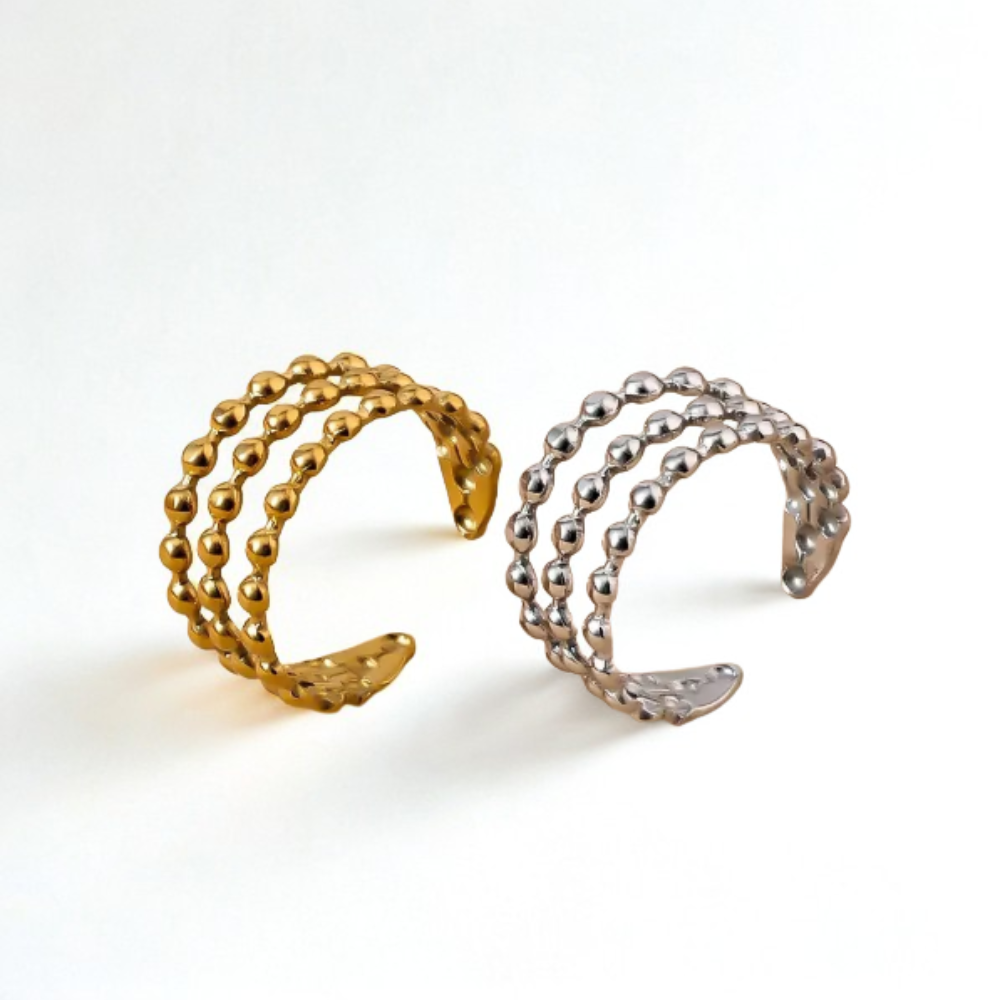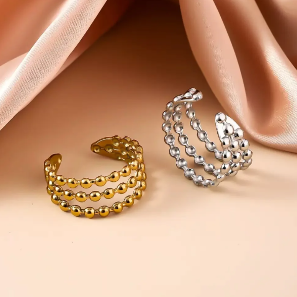 Bold triple-layer beaded ring with a modern stacked design. Resizable for the perfect, comfortable fit on any finger.