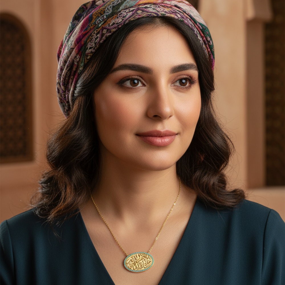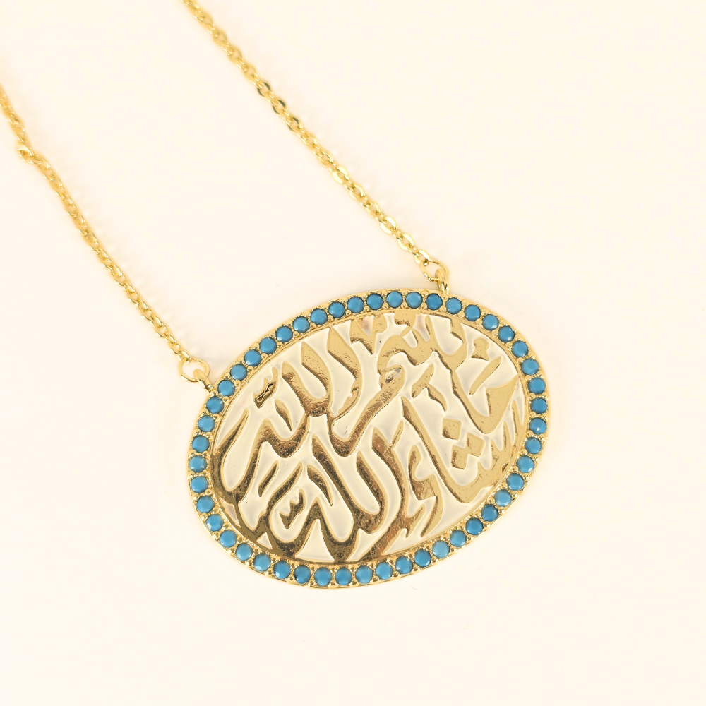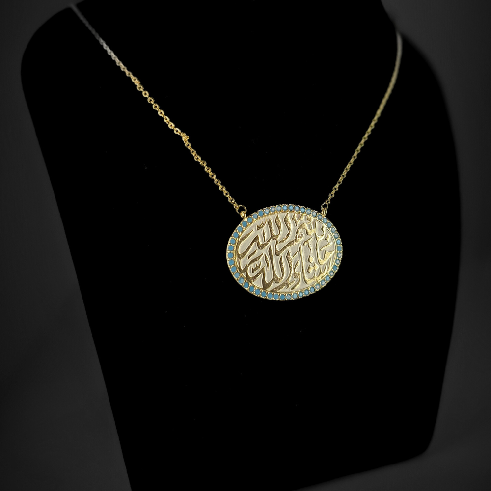 An elegant oval pendant featuring graceful Arabic calligraphy, framed with turquoise stones on a delicate gold chain for a serene, meaningful statement. Perfect for everyday or special moments.