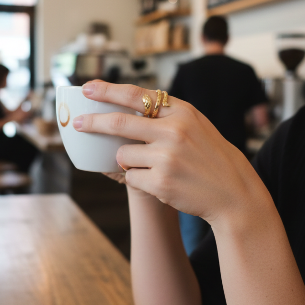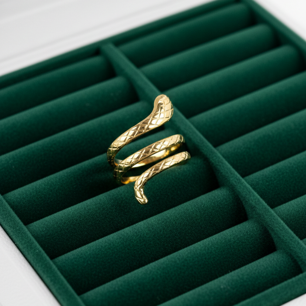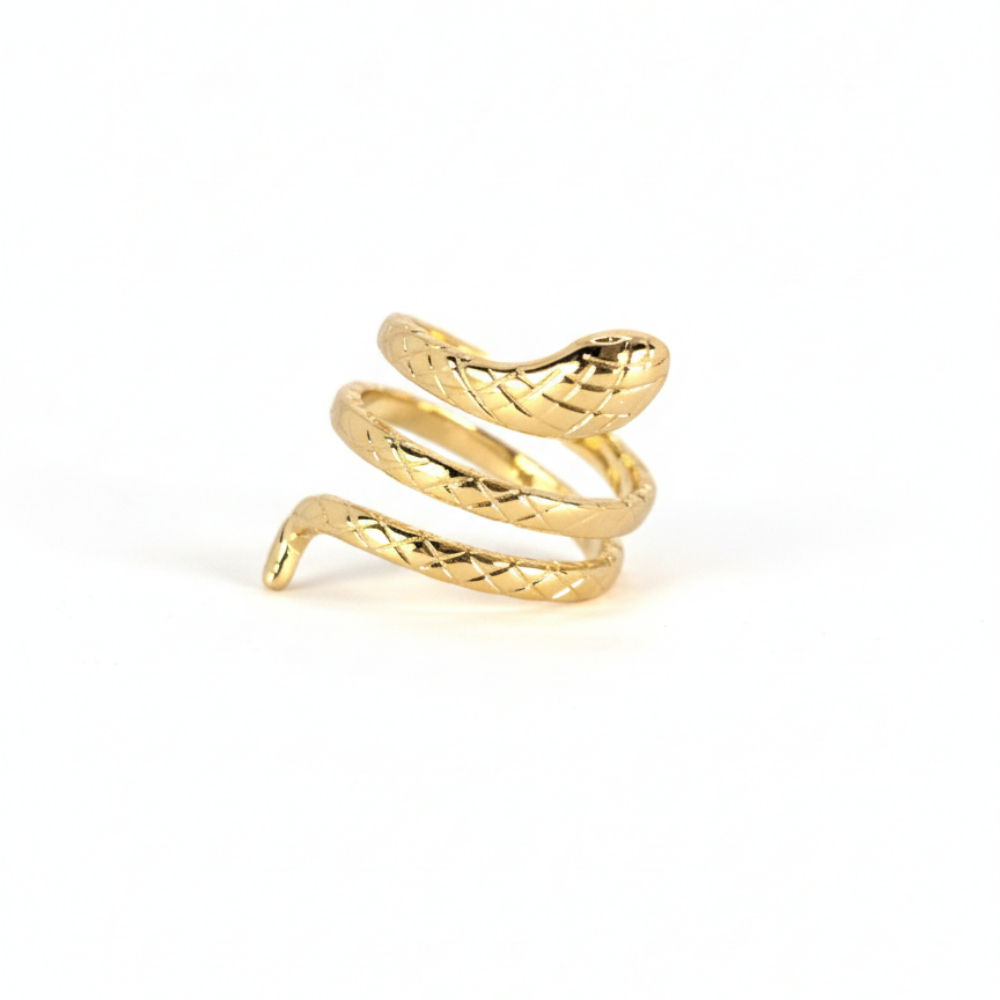 A bold, resizable Cobra ring with a textured gold finish, wrapping elegantly around the finger for a striking and modern statement.