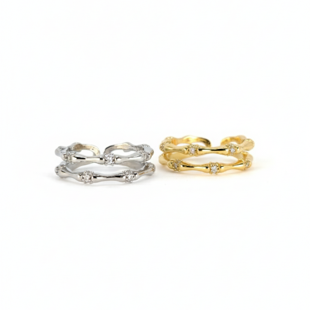 A delicate, resizable double-band ring adorned with tiny sparkling stones, available in gold or silver for a graceful, feminine, and adjustable everyday look.