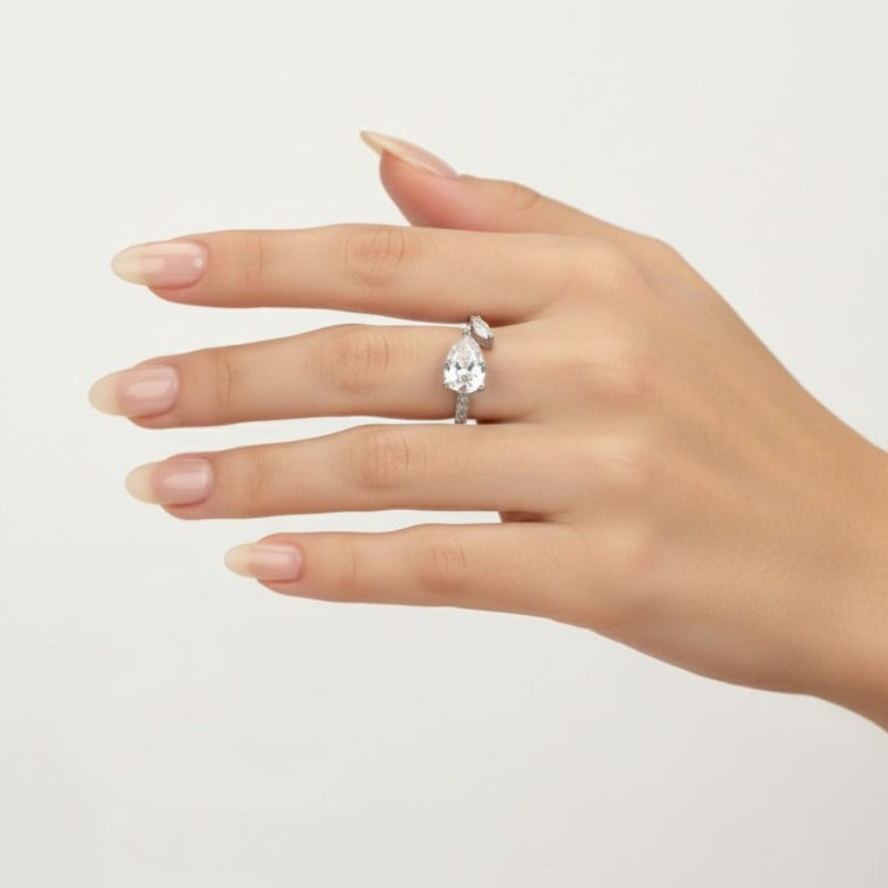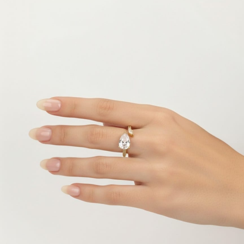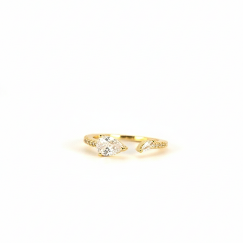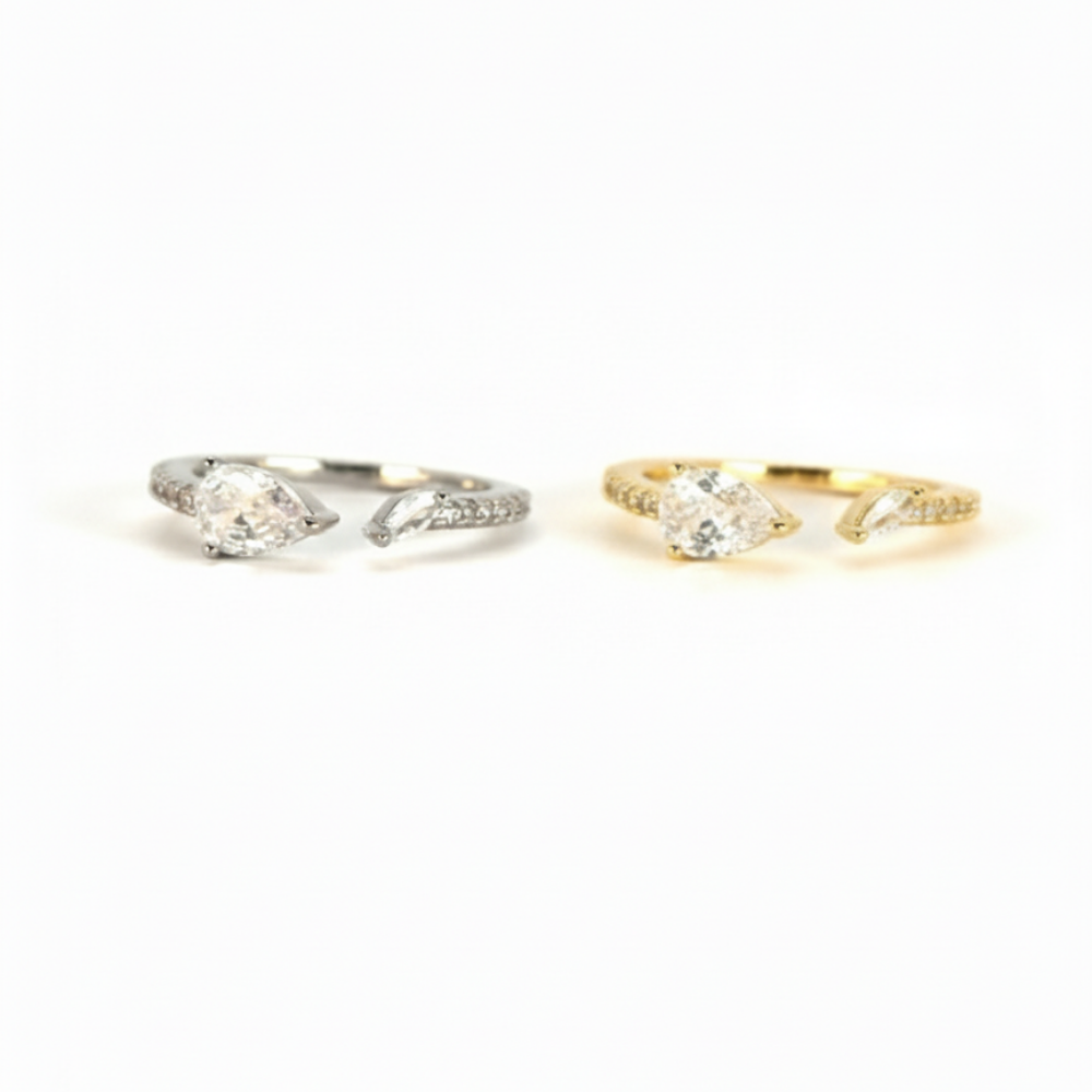 A refined, resizable open ring featuring a pear-cut crystal and delicate pavé accents, available in gold or silver for a luminous, graceful everyday statement.
