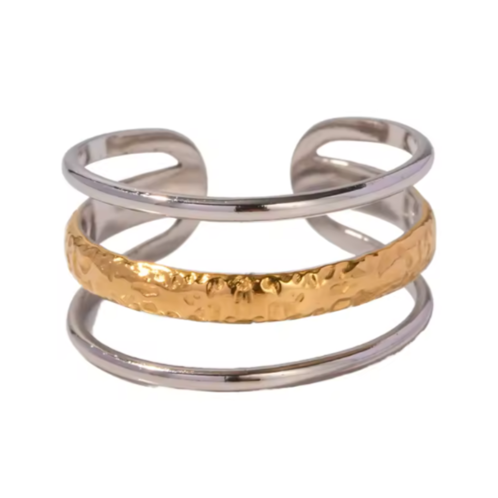 Modern two-tone ring combining silver and gold finishes with a hammered texture — resizable, stylish, and perfect for an effortlessly chic everyday look.