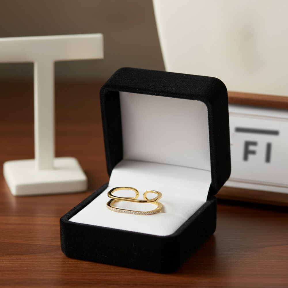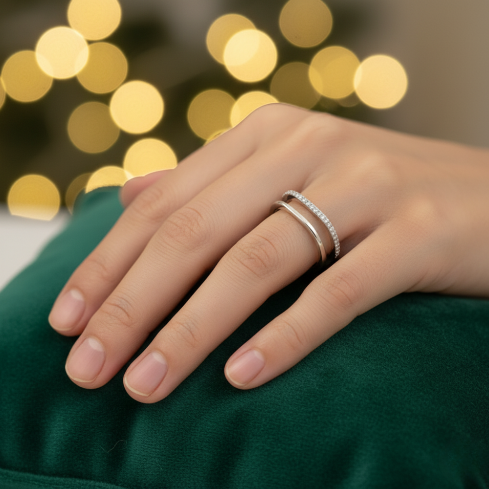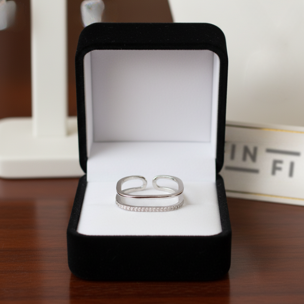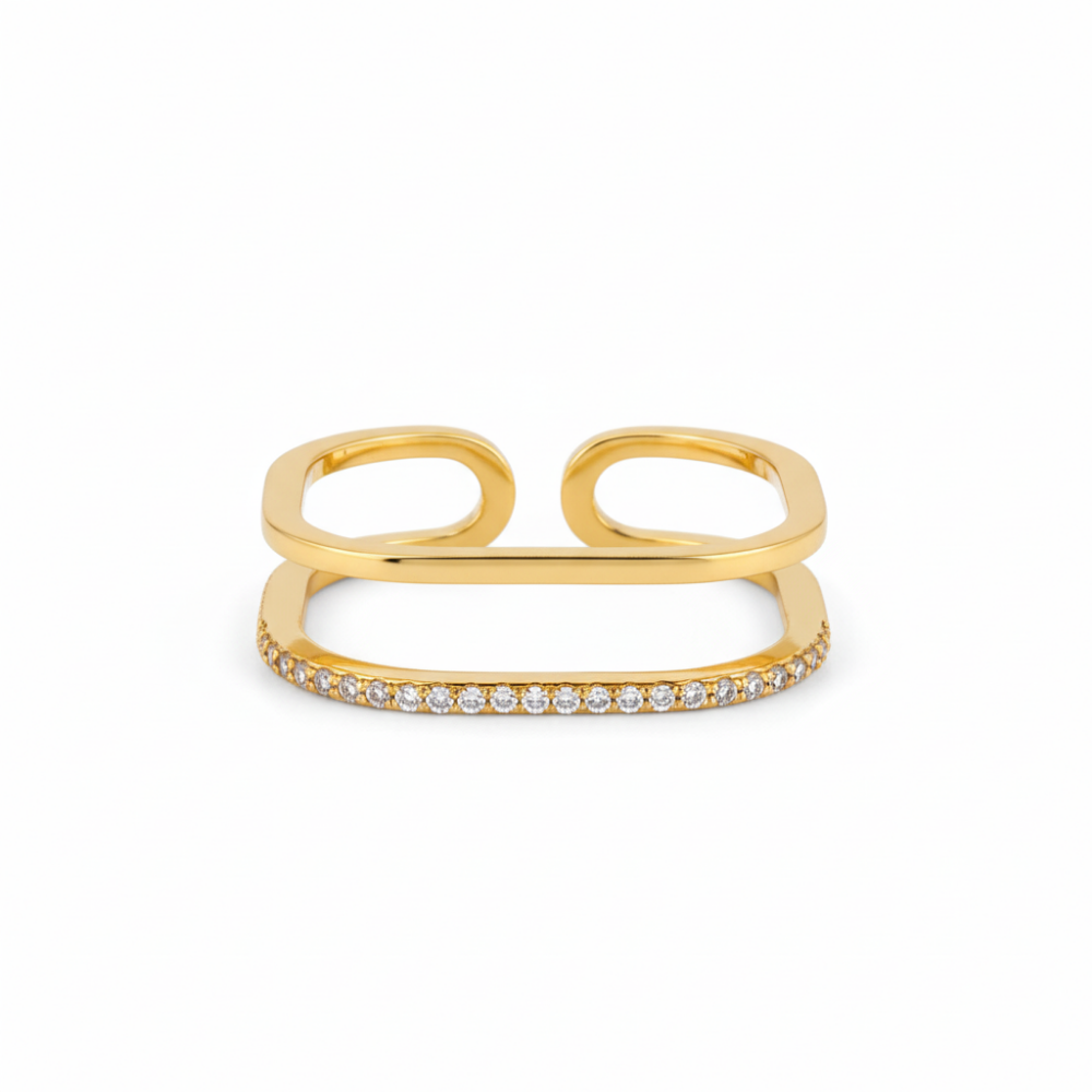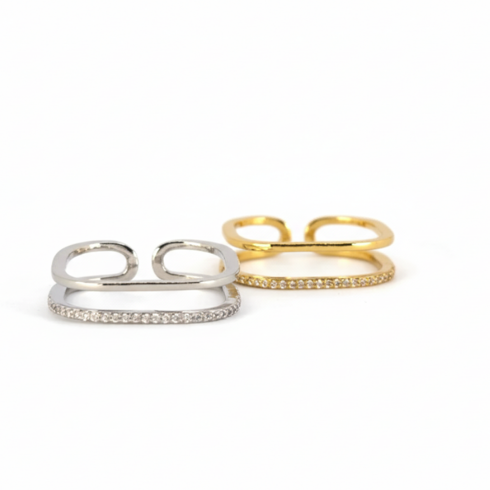 A modern, resizable double-band ring with a sleek open design and subtle sparkle, available in gold or silver for a refined, minimalist statement.