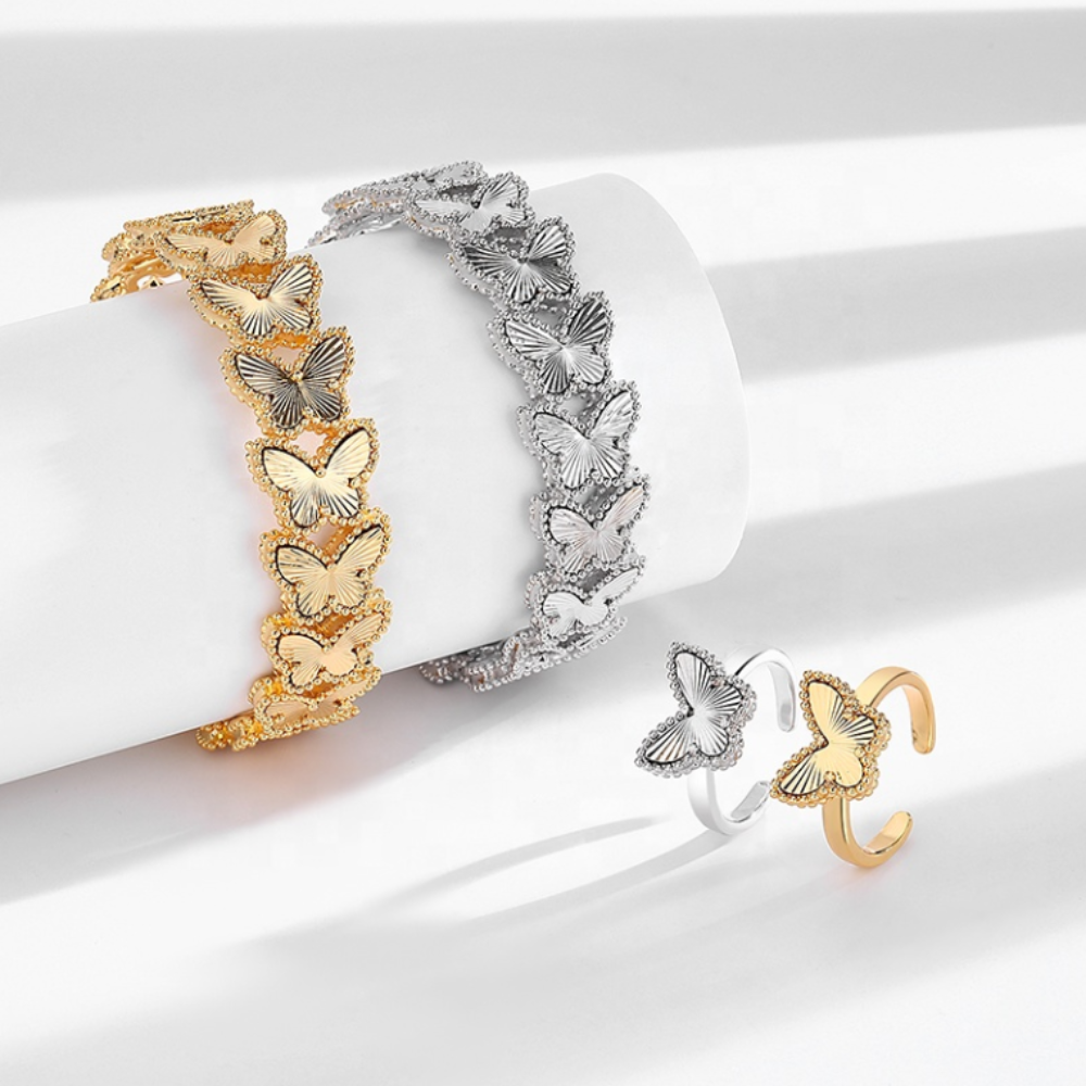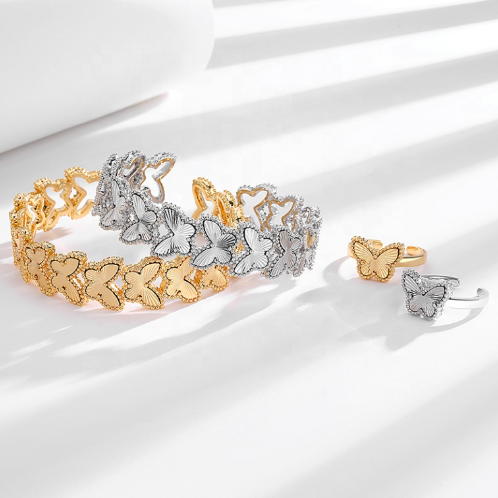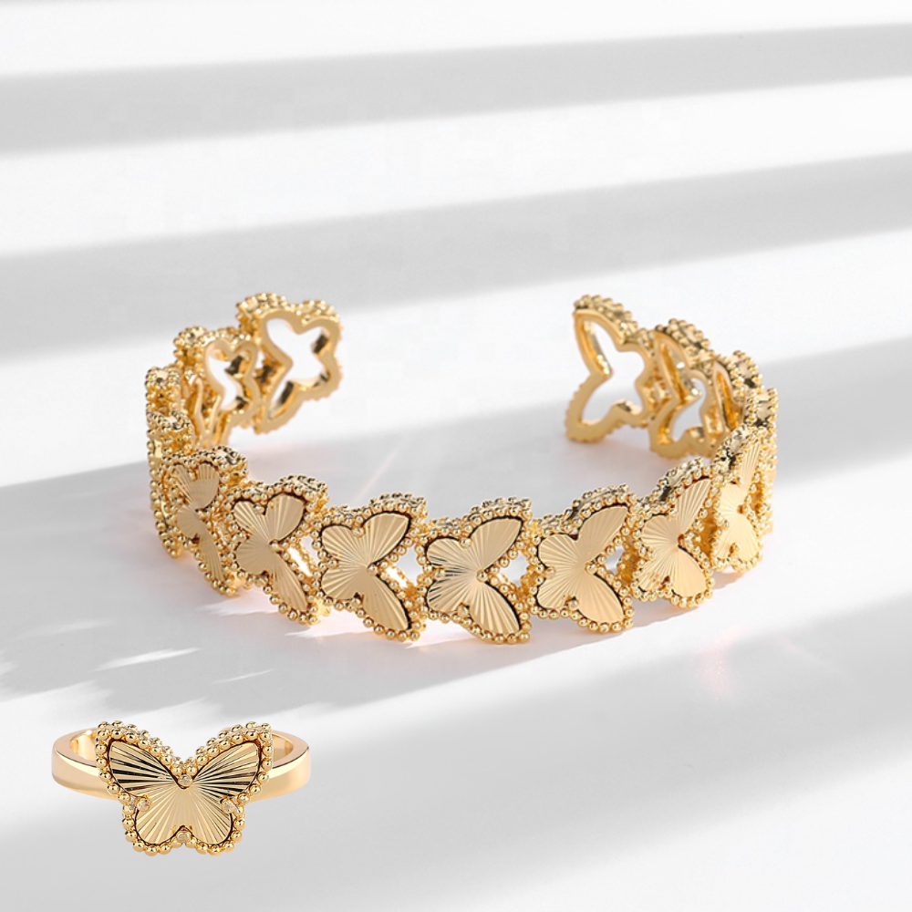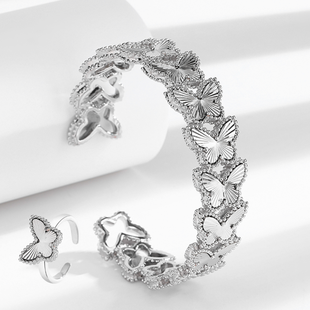 Elegant butterfly-inspired set with a sparkling finish. The ring is adjustable free size for ultimate comfort and fit. Perfect for a soft, graceful statement.