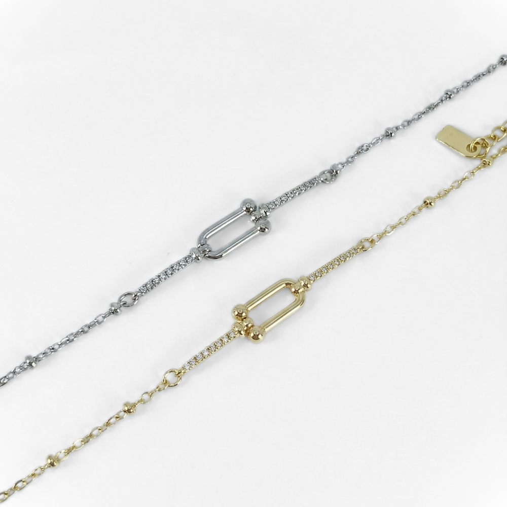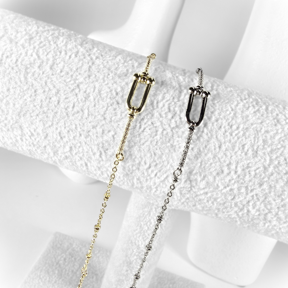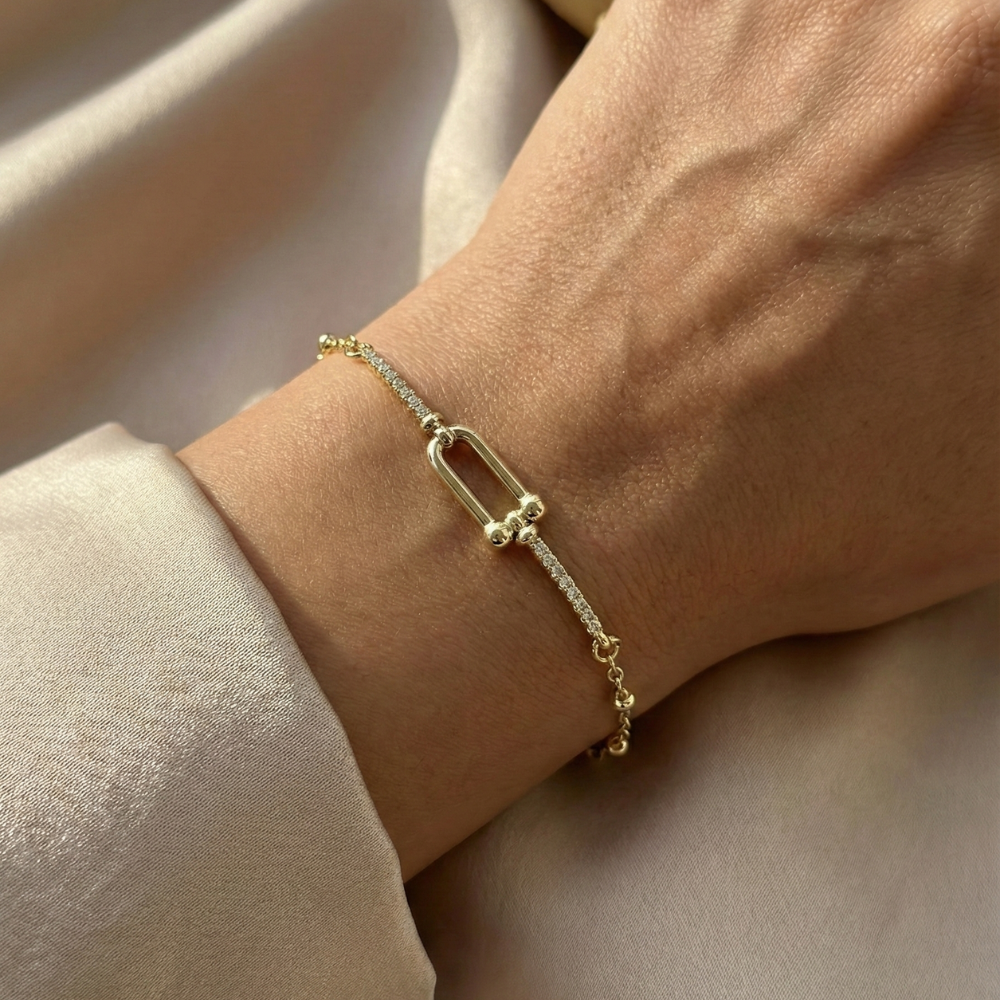 A delicate, minimalist chain bracelet with a polished center detail and subtle sparkle. Lightweight, elegant, and adjustable in size — perfect for everyday wear or effortless layering.