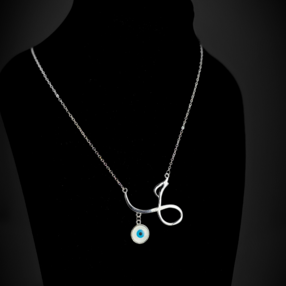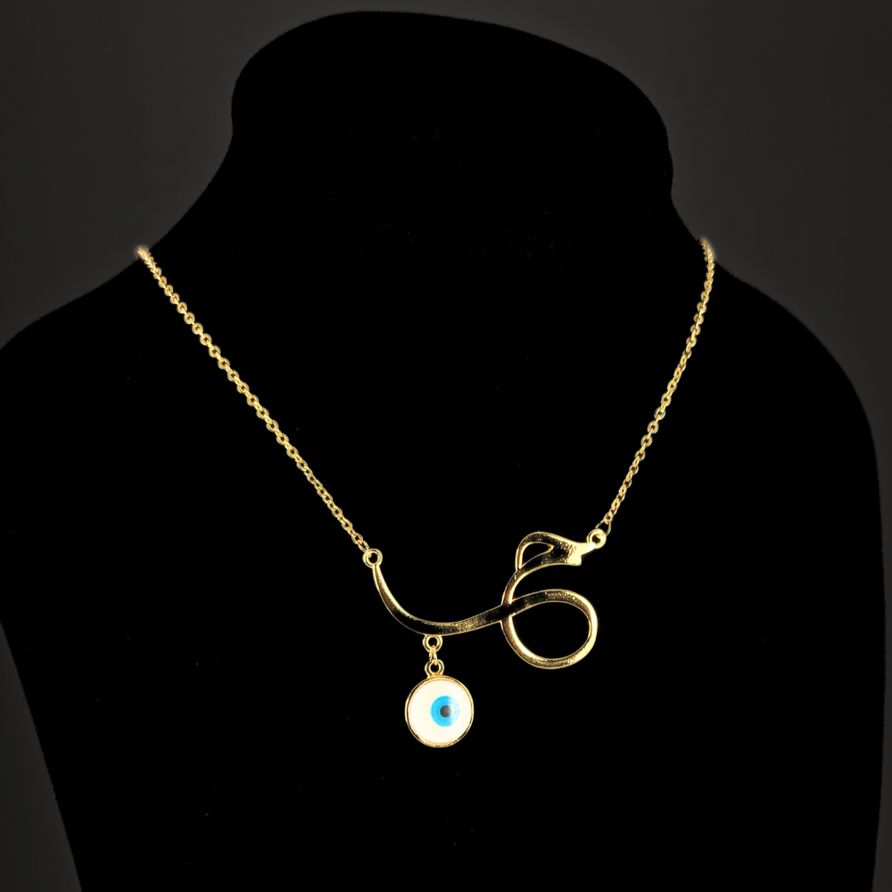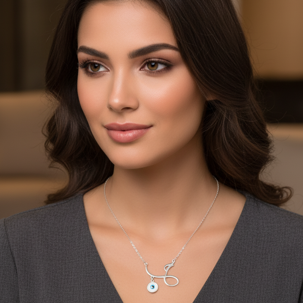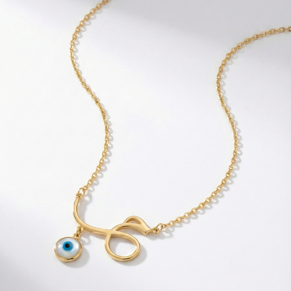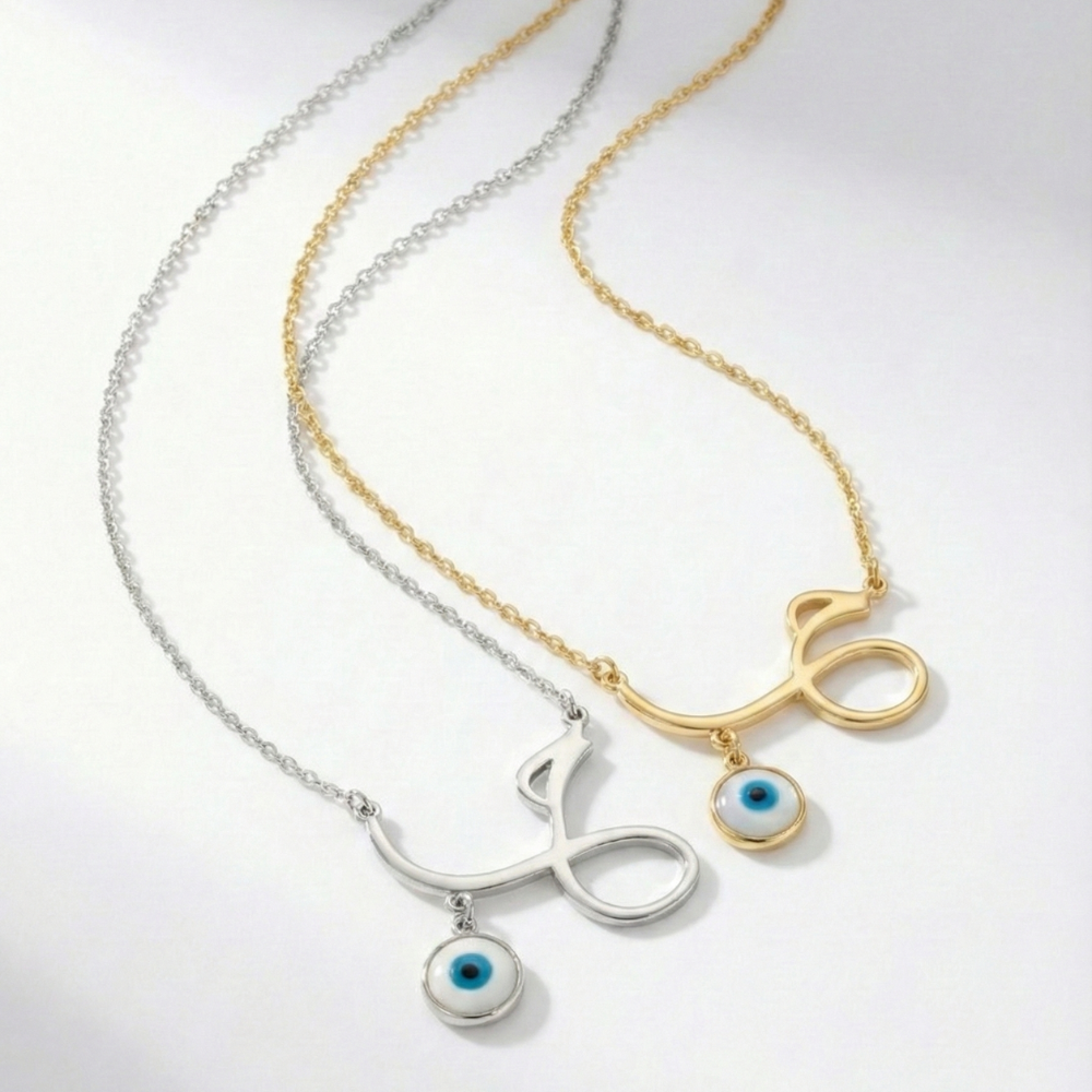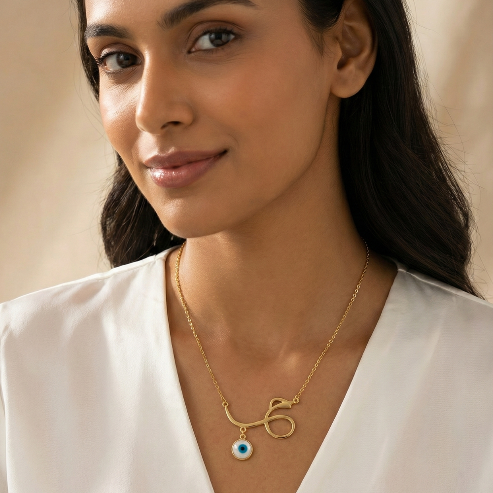 A graceful Arabic-inspired pendant paired with a protective evil eye charm, symbolizing love and protection on a delicate chain for a meaningful, elegant everyday look.