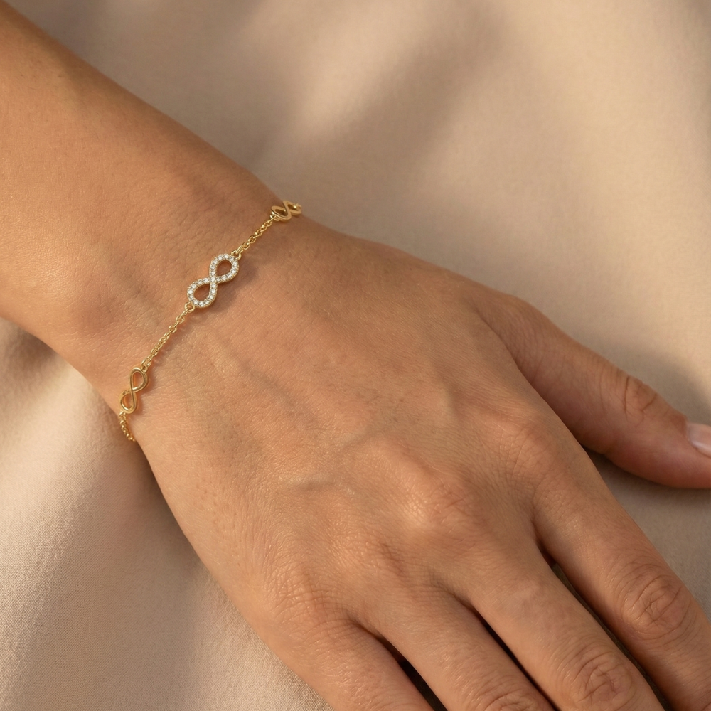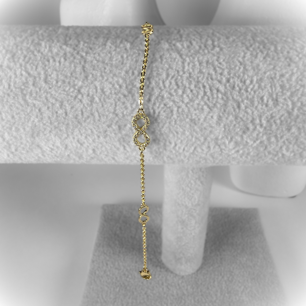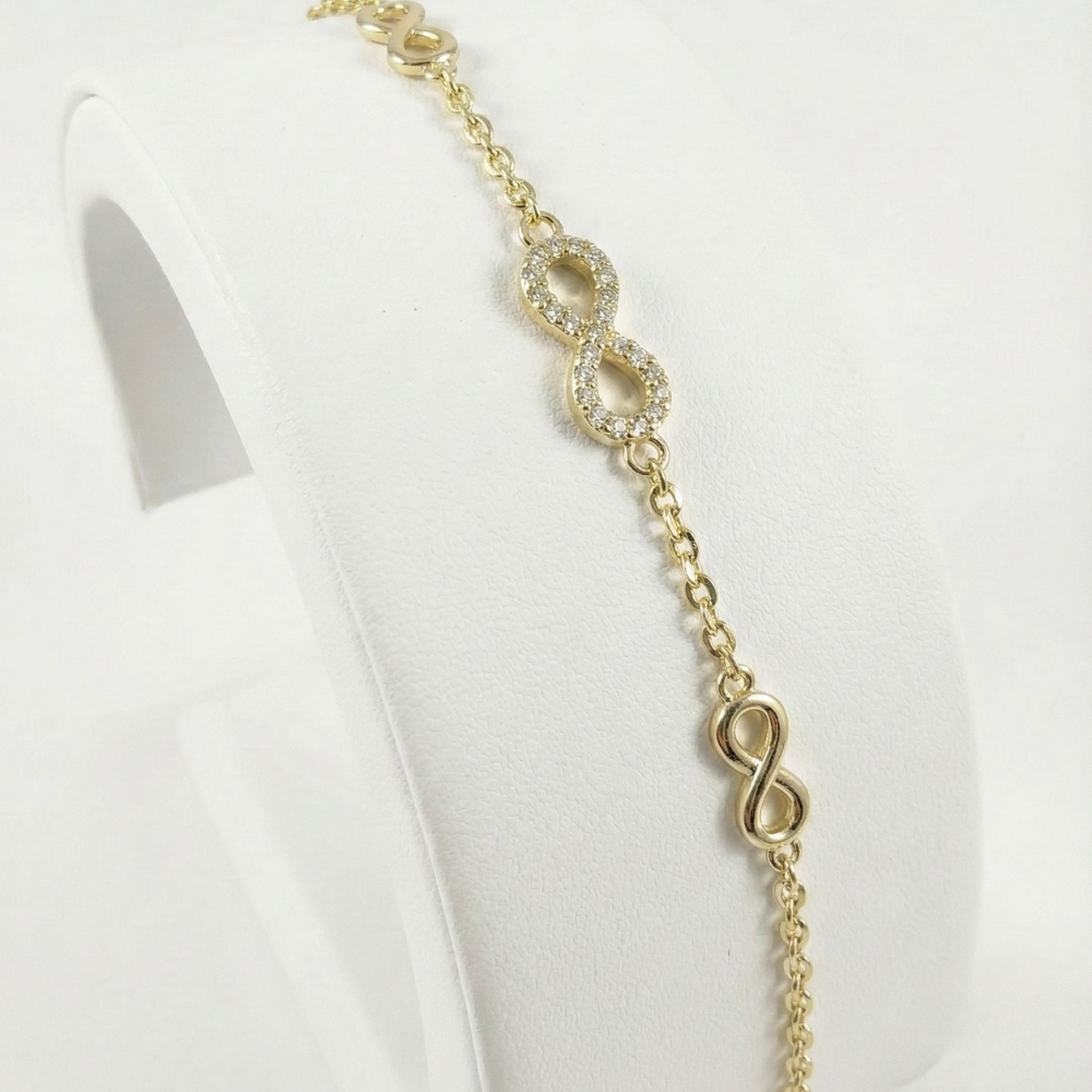 A delicate gold-tone bracelet adorned with shimmering infinity charms, symbolizing endless elegance and love. Lightweight and feminine, perfect for everyday wear or a meaningful gift.
