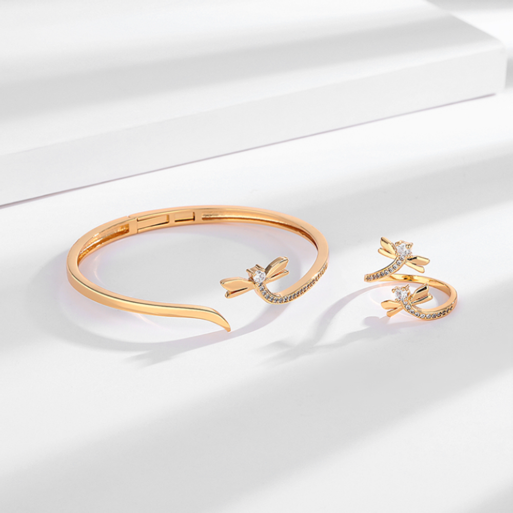 A graceful bracelet and ring set with butterfly-inspired design. The ring is adjustable, free size for your comfort.