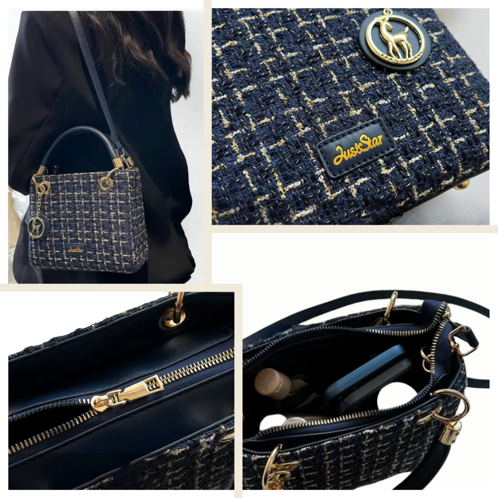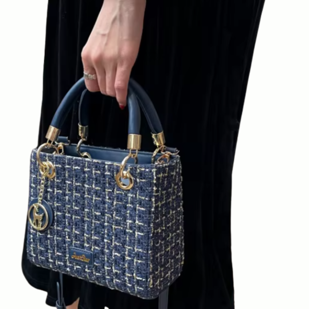 Elegant Blue tweed handbag with gold details, structured silhouette, and double handles. Features a secure zip closure and crossbody strap for a stylish, modern look day or night.