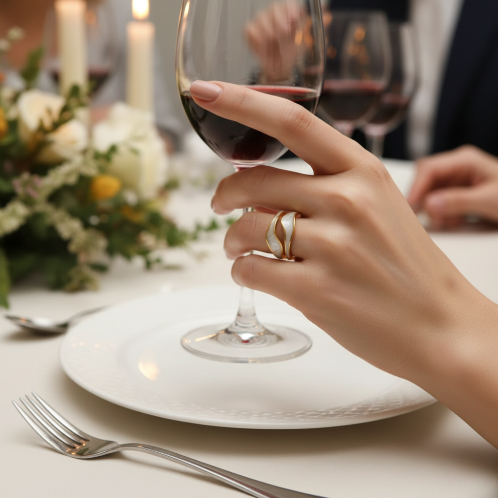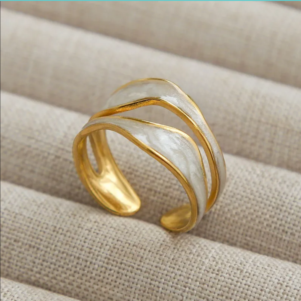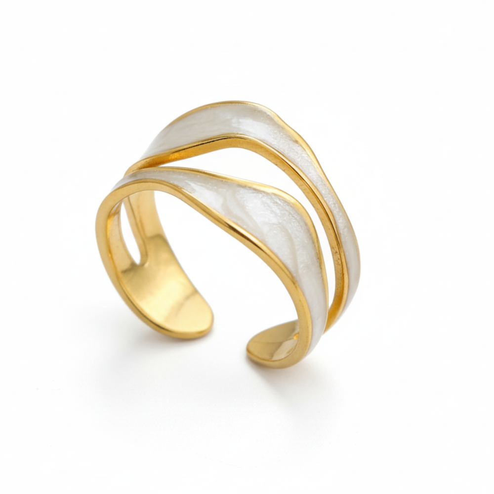 Gold-plated ring with a flowing double-wave white enamel design — resizable and perfect for adding a touch of modern elegance to any look.
