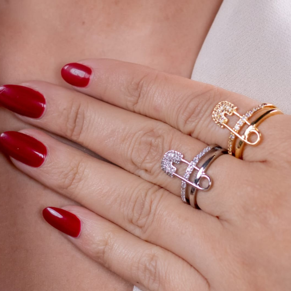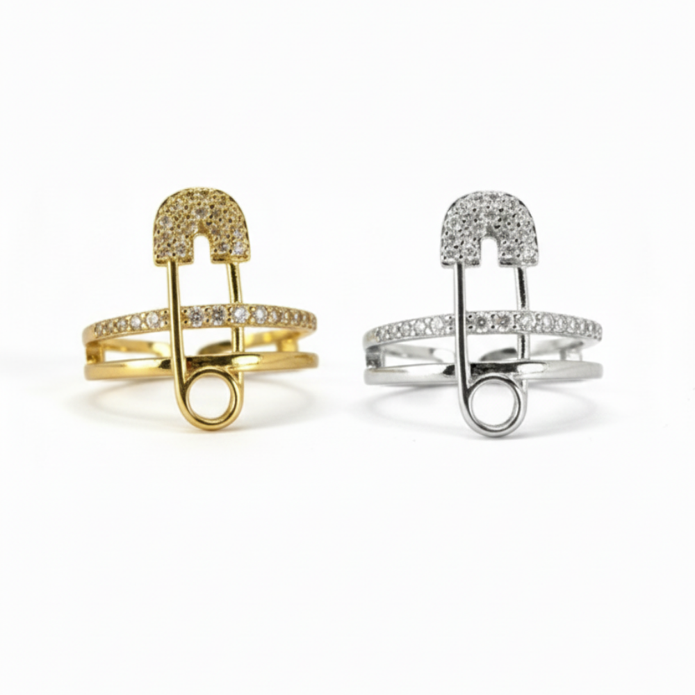 A bold, resizable statement ring inspired by a safety pin silhouette, finished with shimmering crystals in gold or silver for a modern, edgy touch.