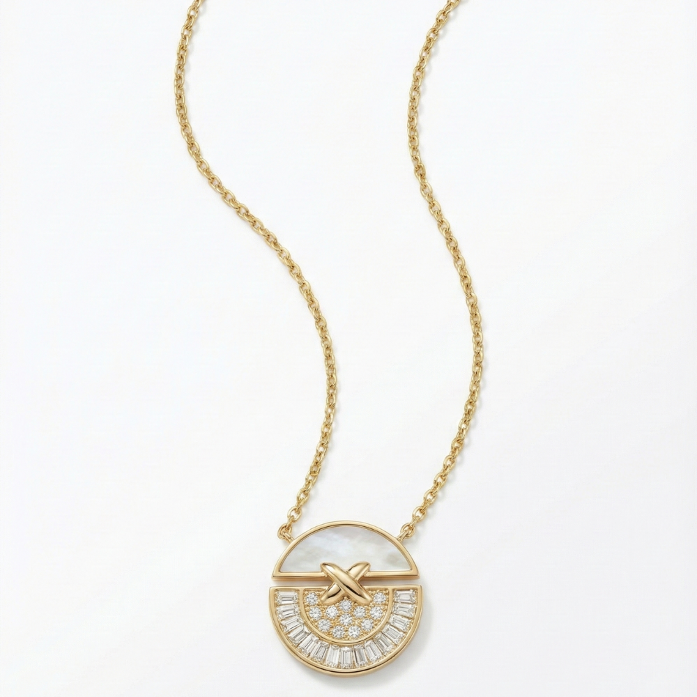 A half-moon pendant with shimmering crystal details and a soft pearl finish. Elegant, modern, and perfect for effortless everyday shine.