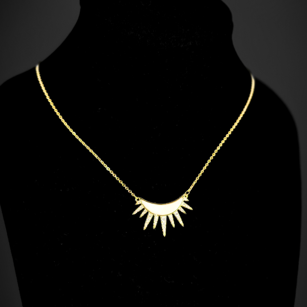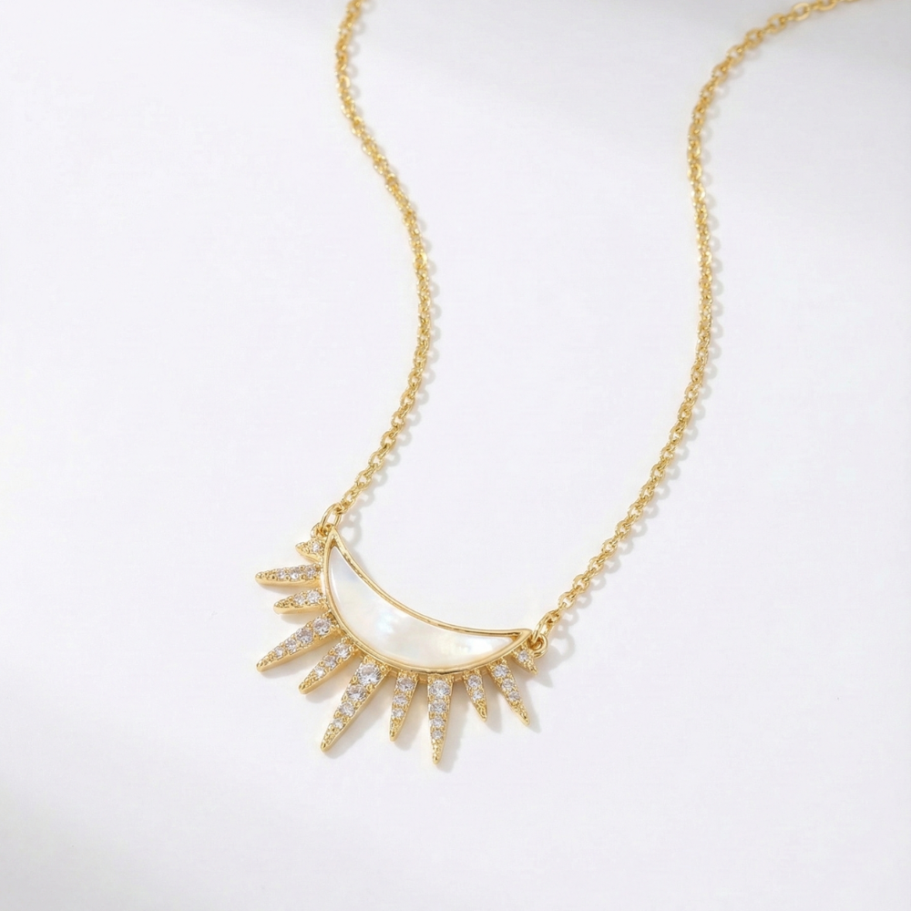 A radiant crescent pendant with mother-of-pearl glow and sparkling rays, set on a delicate gold chain for a dreamy, sun-kissed elegance.
