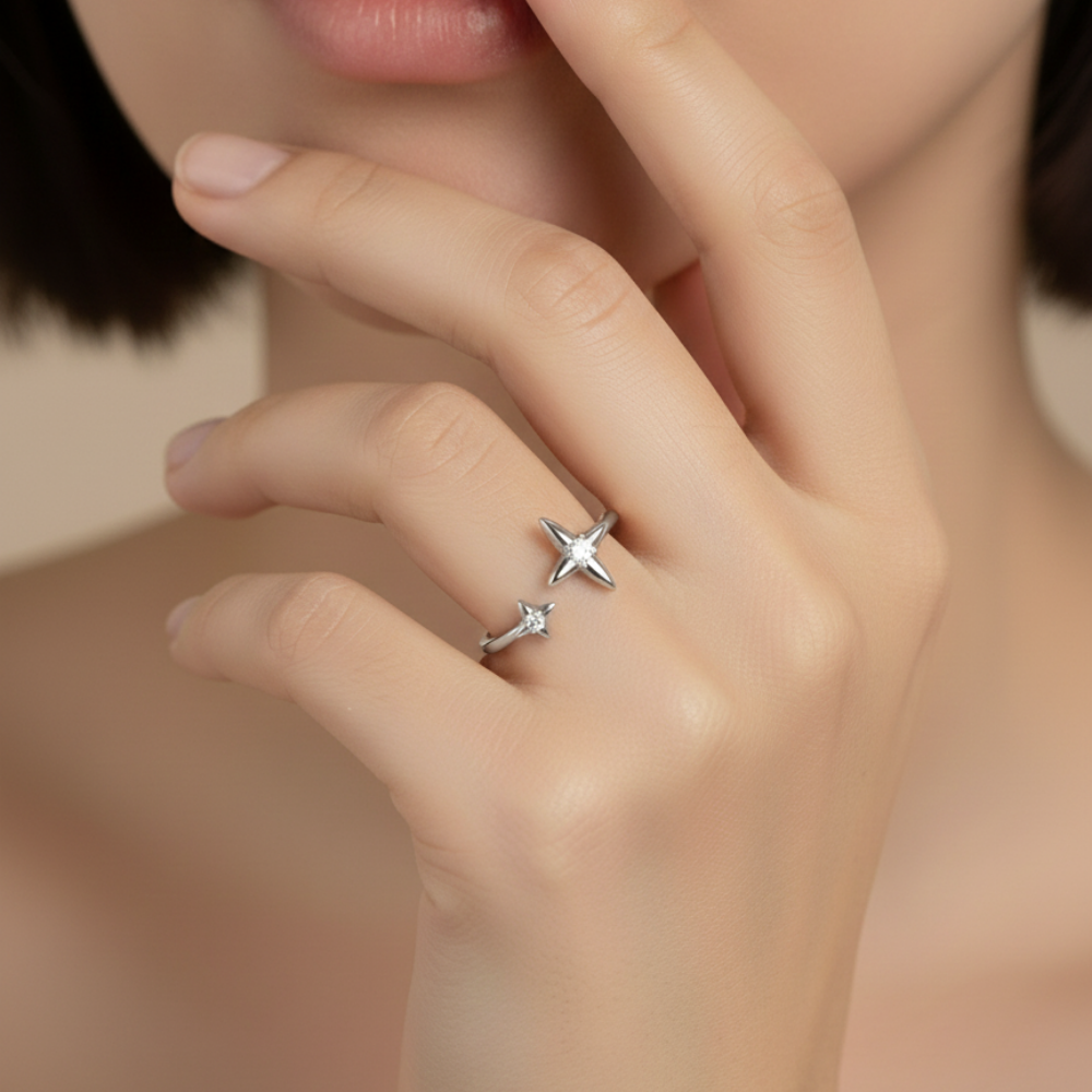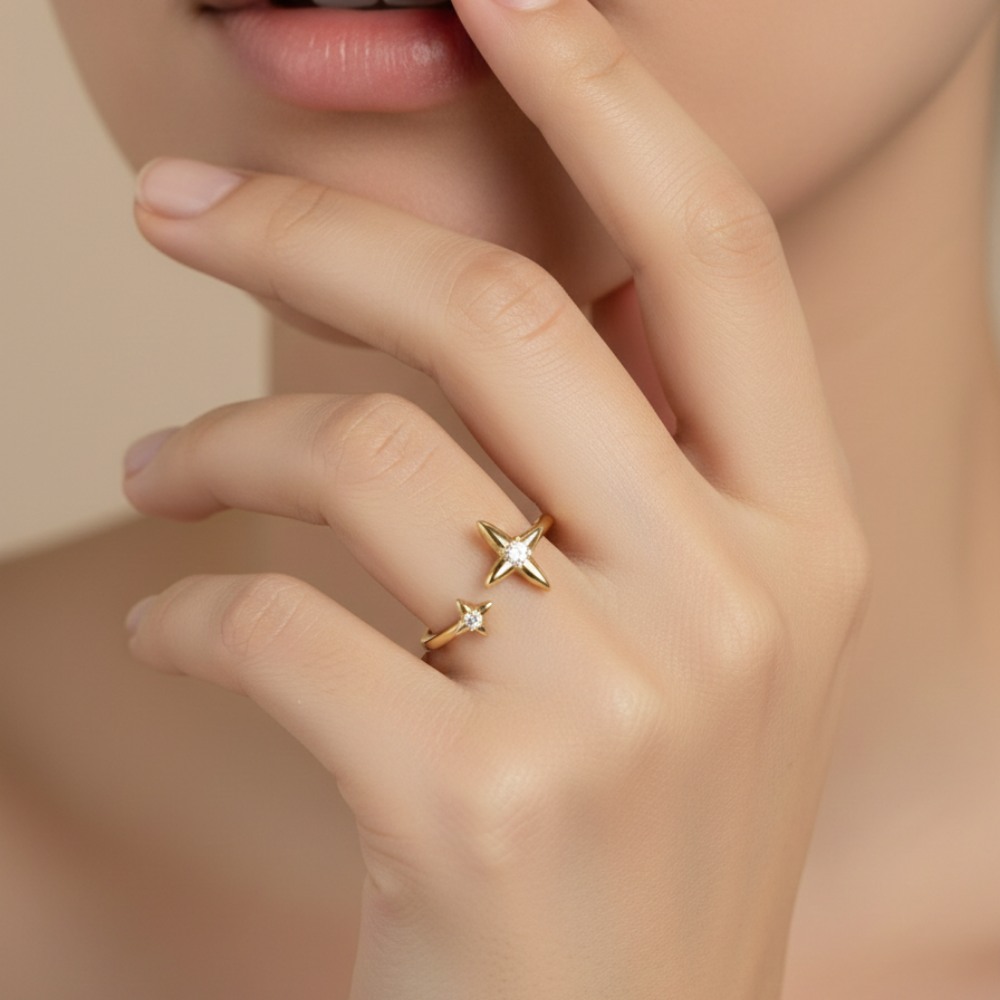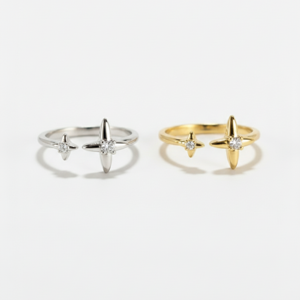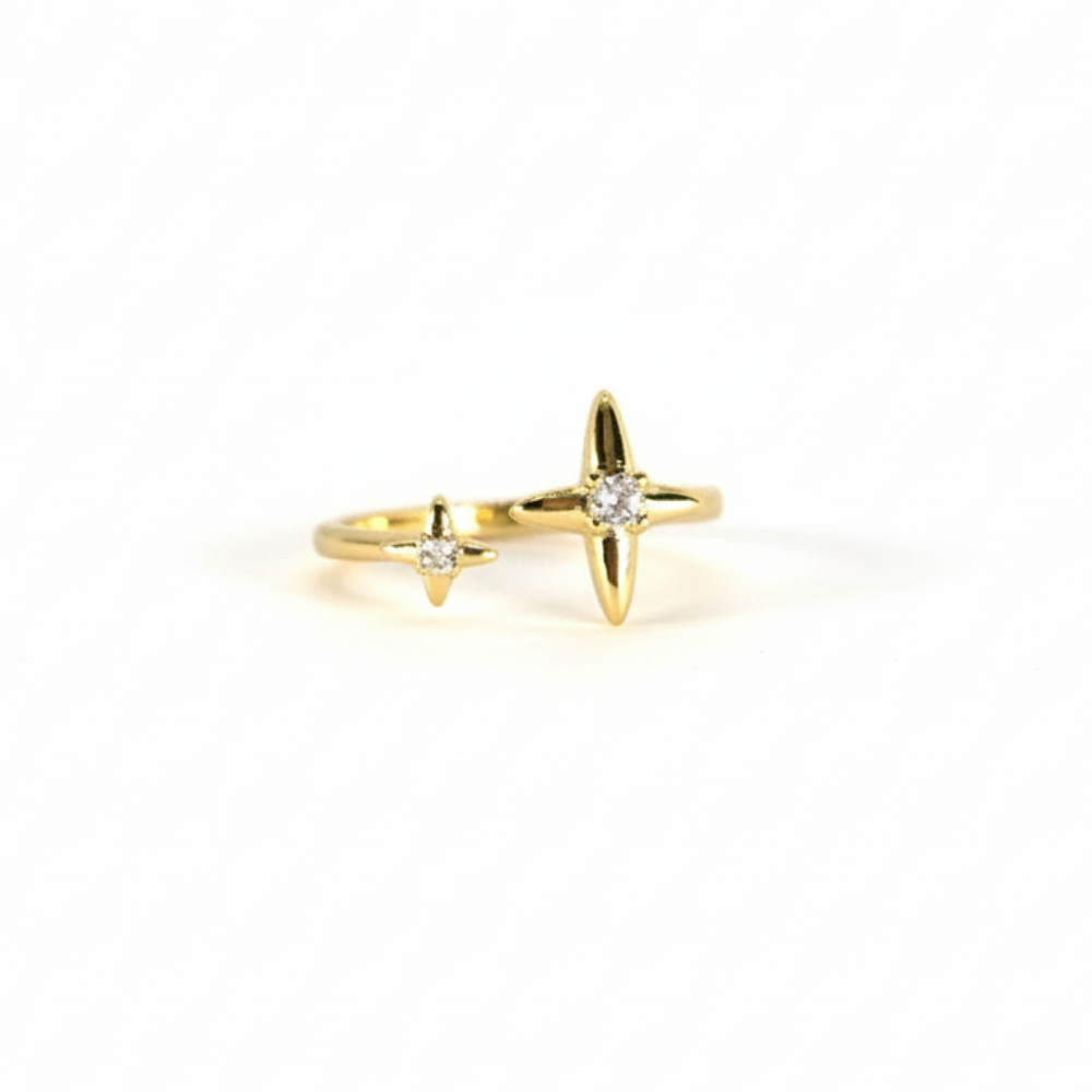 A delicate star-inspired ring with sparkling crystal accents, available in gold or silver. Fully resizable for a perfect fit and ideal for everyday shine or layering.