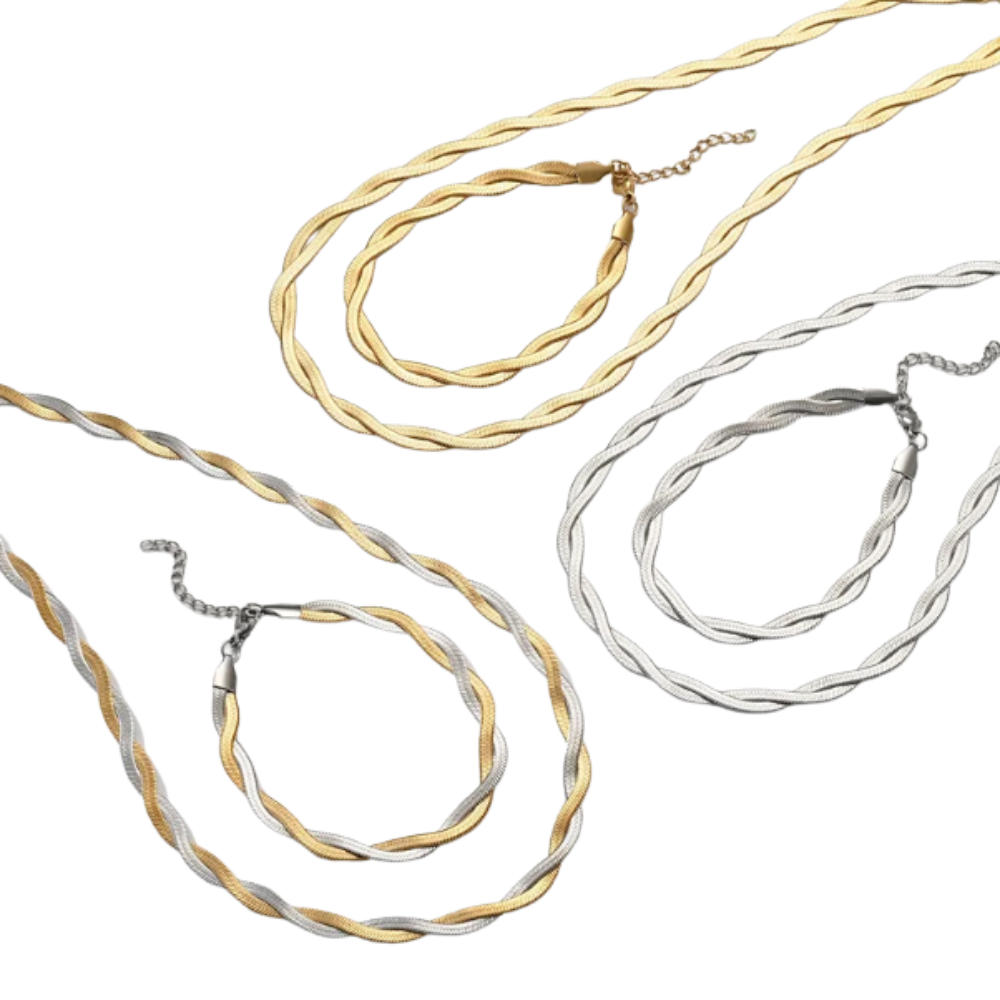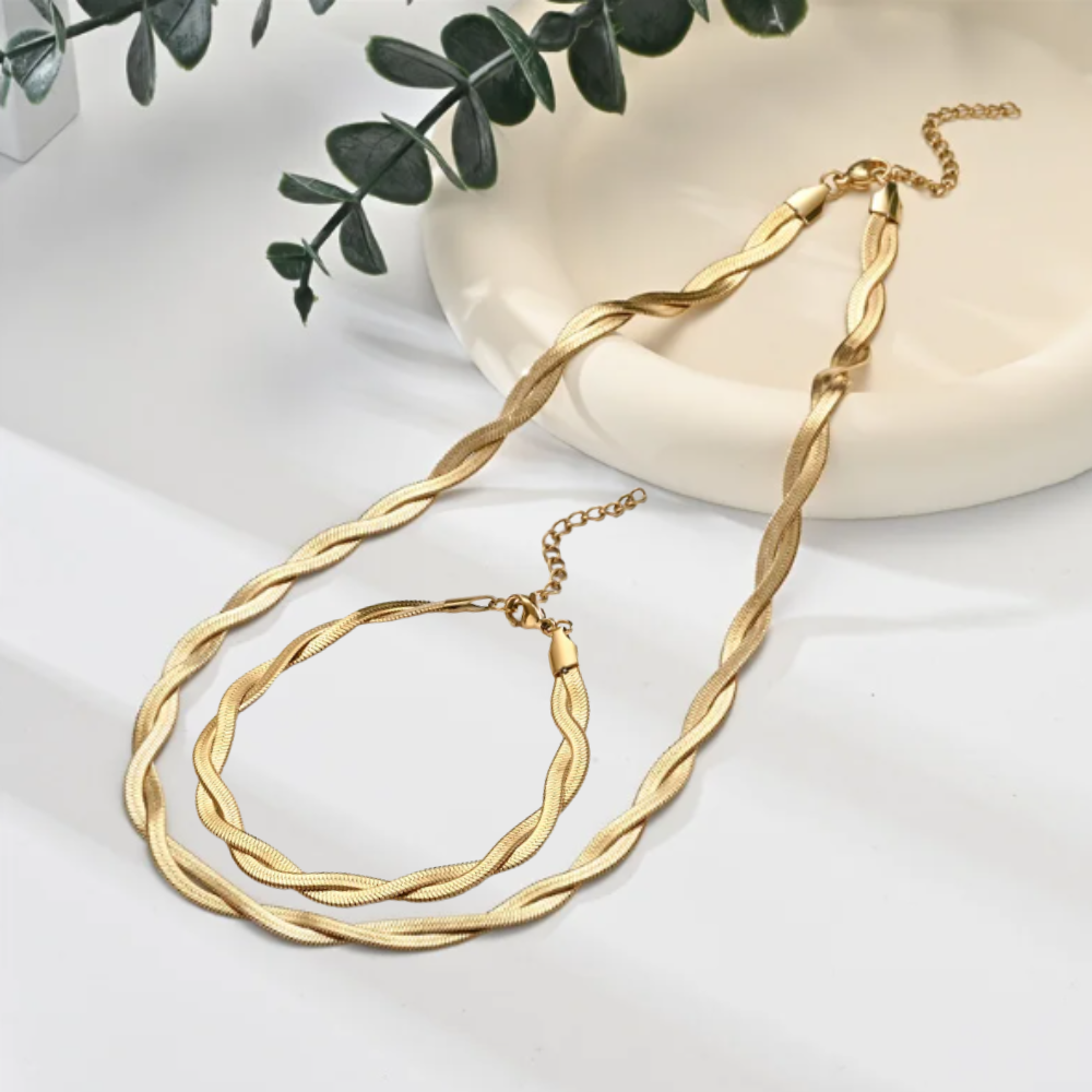 A sleek twisted set of necklace and bracelet, perfect for adding modern shine and effortless elegance to your daily or evening look.