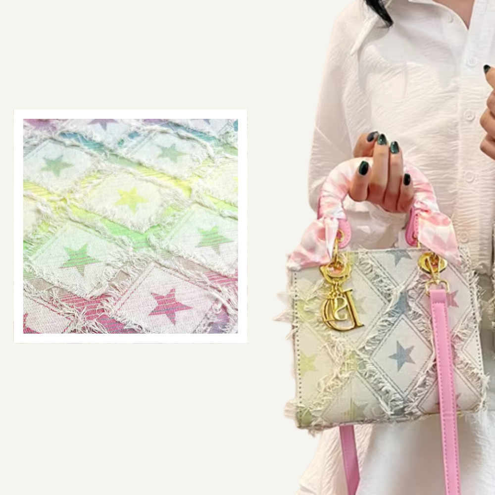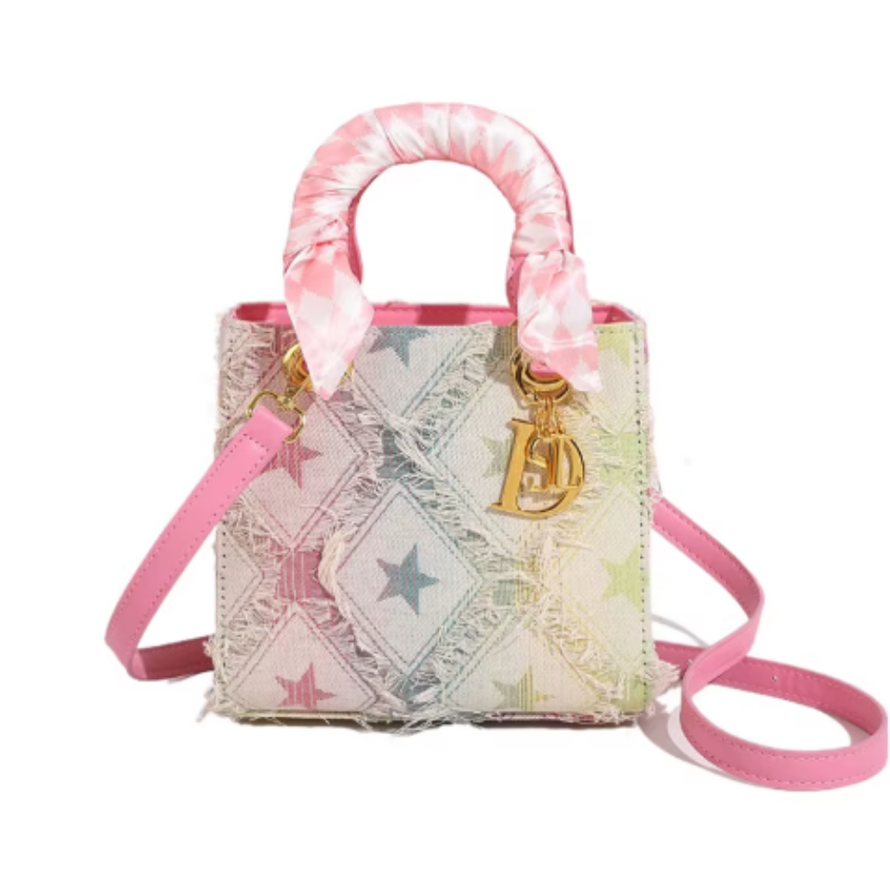 Chic mini bag with pastel rainbow stars, pink leather strap, and matching wrapped handle for a playful, feminine look.