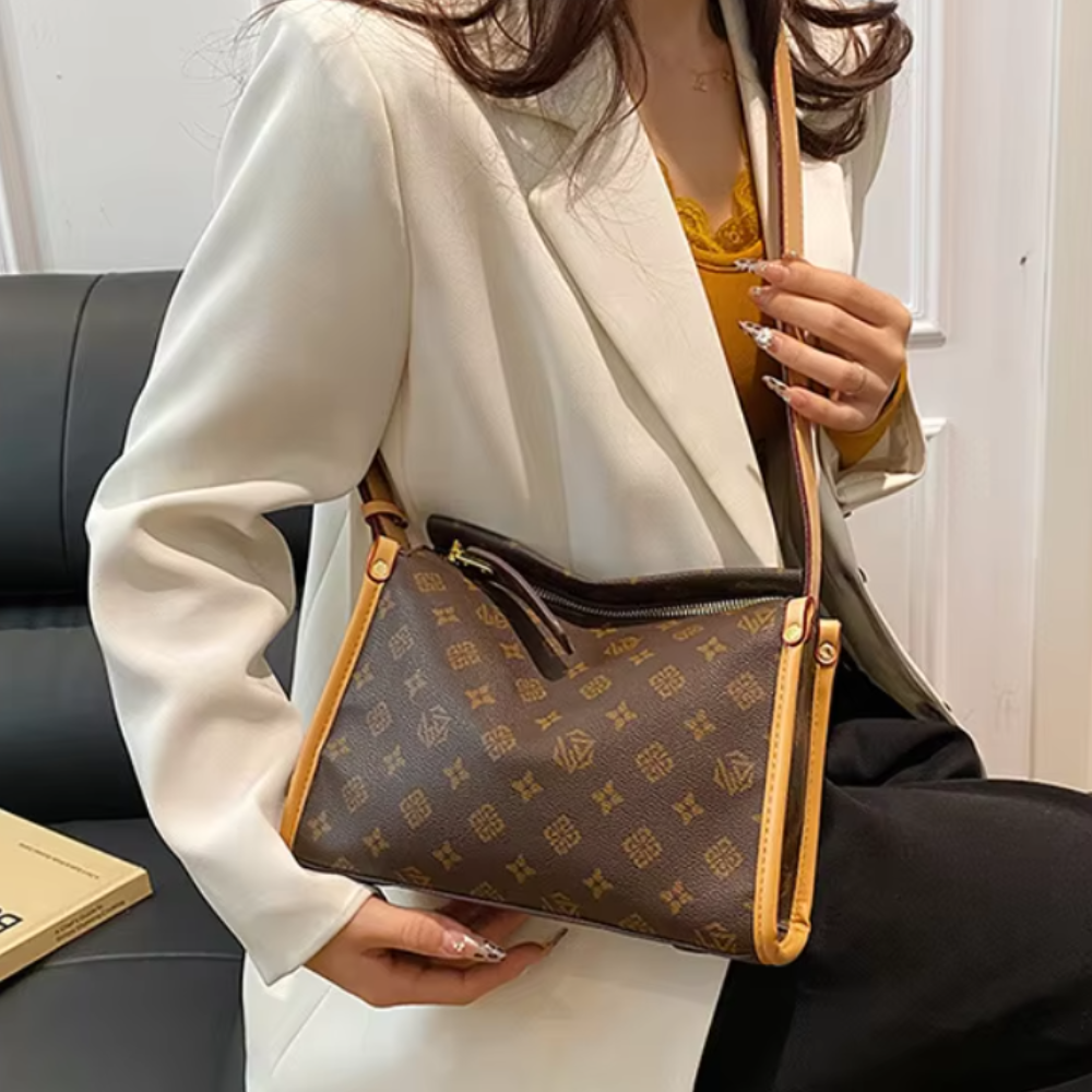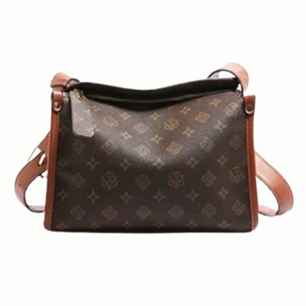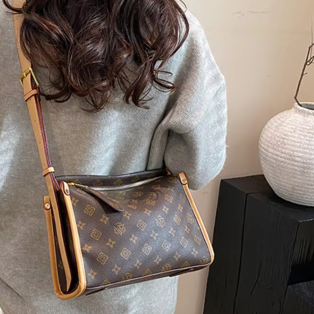 Elegant Khaki crossbody with a monogram finish and tan edges — perfect for a chic, effortless everyday look.